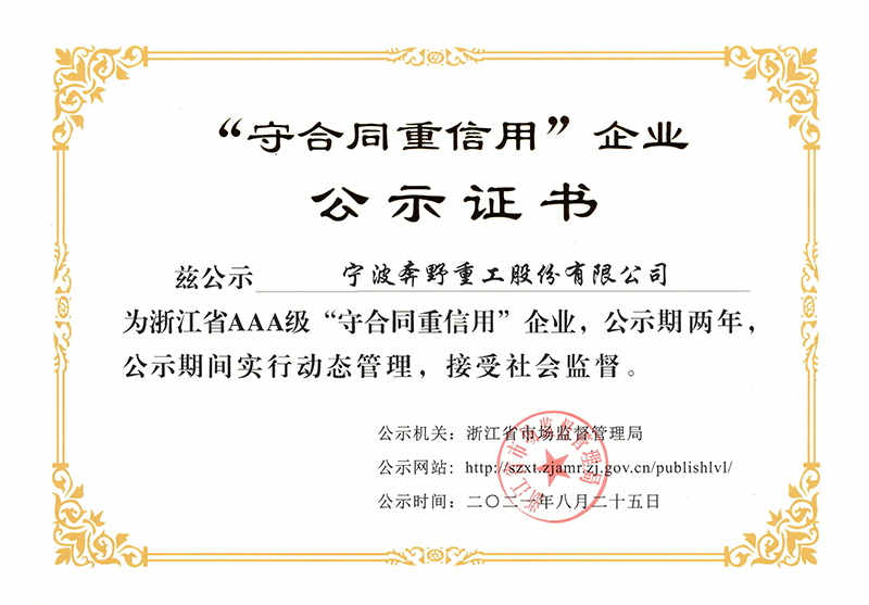 近日,寧波奔野重工股份有限公司再次被浙江省市場監(jiān)督管理局公示為浙江省AAA級“守合同重信用”企業(yè),公示期2年。