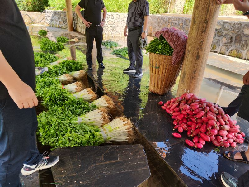 兩河村目前種植蔬菜300畝,年產(chǎn)值在500萬以上,蔬菜種類有蒜苗、芹菜、蘿卜、茄子、西紅柿、辣椒等等,都是日常餐飲蔬菜,主要供應(yīng)周邊地區(qū),最遠(yuǎn)可以供到成都市。兩河村勞動(dòng)力有110個(gè),3/4都在地里干活,很少去外面打工,此處類似于一處“世外桃源”。由于每家每戶的田塊較小,所以各家土地勞作都是以人力種植。田間走訪時(shí)只看到一臺(tái)長寬高都在50公分內(nèi)的小農(nóng)機(jī)放在水渠邊。村里有一臺(tái)拖拉機(jī)但很久沒有使用了。 此次安排奔野重工與兩河村對(duì)接,初衷在于看雙方是否能在“農(nóng)業(yè)+農(nóng)機(jī)”方面碰撞出一定的火花。目前村里有4個(gè)外面來的常駐人員,負(fù)責(zé)將蔬菜收走,賣到外面去。下圖為村民把采收的蔬菜浸在天然冰冷的溪水中等待當(dāng)天收走。