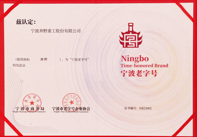 2023年11月12日,第三批“寧波老字號”授牌儀式在寧波國際會展中心2023中國(寧波)食品博覽會現(xiàn)場隆重舉行。本次活動由寧波市老字號企業(yè)協(xié)會會長張空主持,寧波市商務(wù)局副局長葉文濤等領(lǐng)導(dǎo)出席并講話。寧波市商務(wù)局消費(fèi)促進(jìn)處處長尹秋平為寧波奔野重工股份有限公司授牌,“奔野”品牌榮獲寧波老字號稱號。